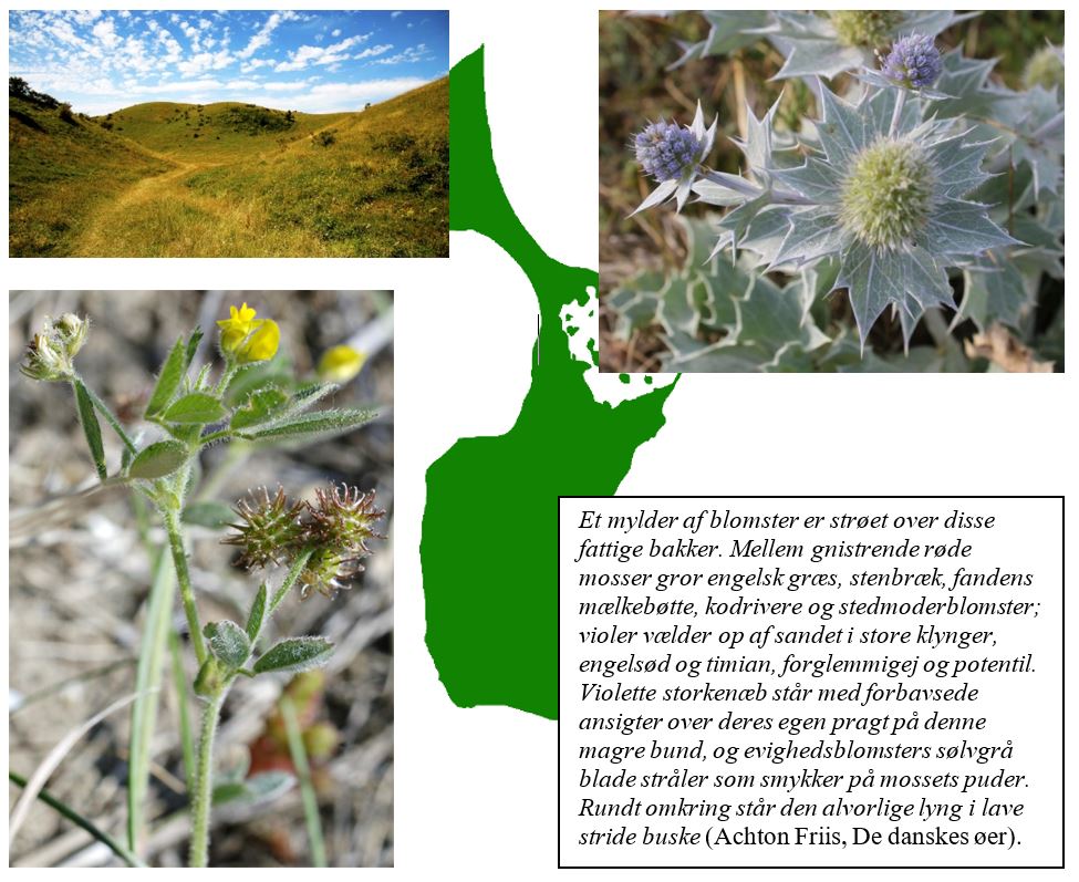 I år går Dansk Botanisk Forenings højsommerekskursion til Samsø. Floraen på Samsø er præget af, at den ligger i det område i landet, hvor storebæltsklimaet hersker – på Samsø er der altså lidt flere solskinstimer og lidt mindre nedbør end landsgennemsnittet. Derfor er især overdrevsvegetationen artsrig og spændende, idet man her vil kunne finde arter, der normalt ikke findes i Danmark, fordi de er tilknyttet lidt tørrere og varmere forhold. Vi skal blandt andet på jagt efter liden sneglebælg, enblomstret fladbælg og knopnellike. Derudover kan man på de stenede strandvolde se strandmandstro, mens lav hindebæger står i fuldt flor på strandengene.