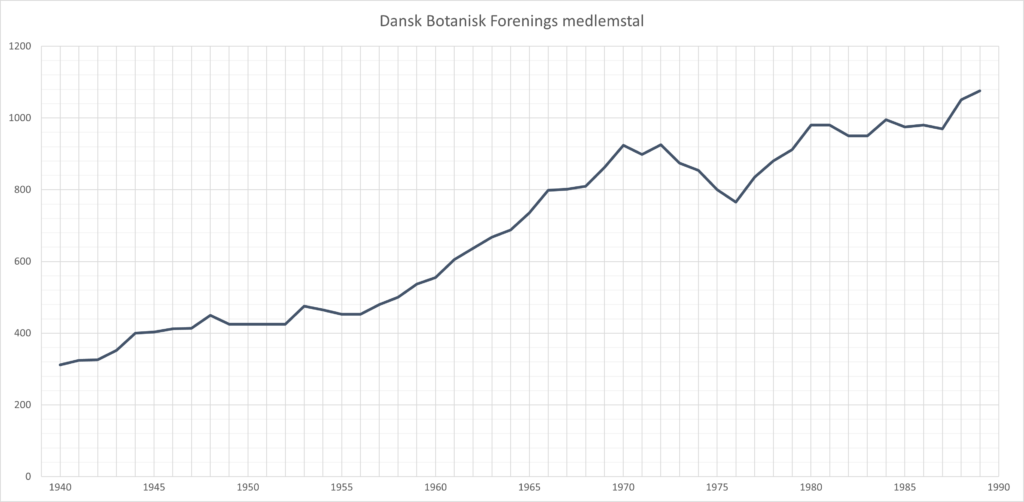 Figur 2. Foreningens medlemstal 1940 – 1989, opgjort ved slutningen af kalenderåret (digitaliseret version 2020. Red. Medlemstallet 2020 er ca. 1600)